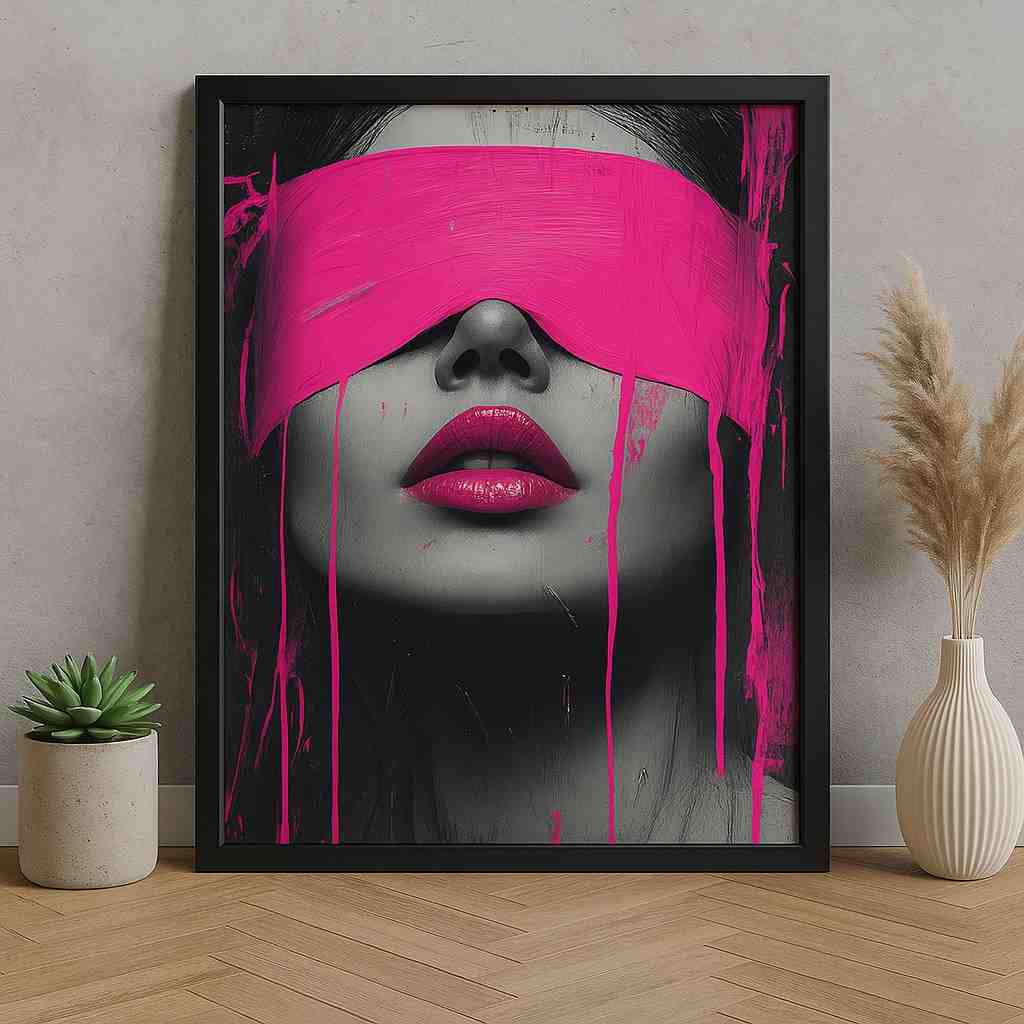 Silent Gaze is a powerful contemporary portrait that blends mystery, emotion, and bold modern expression. The grayscale face contrasted with a vivid pink blindfold and dripping brush strokes creates a striking visual tension—symbolizing unspoken thoughts, inner strength, and modern identity.