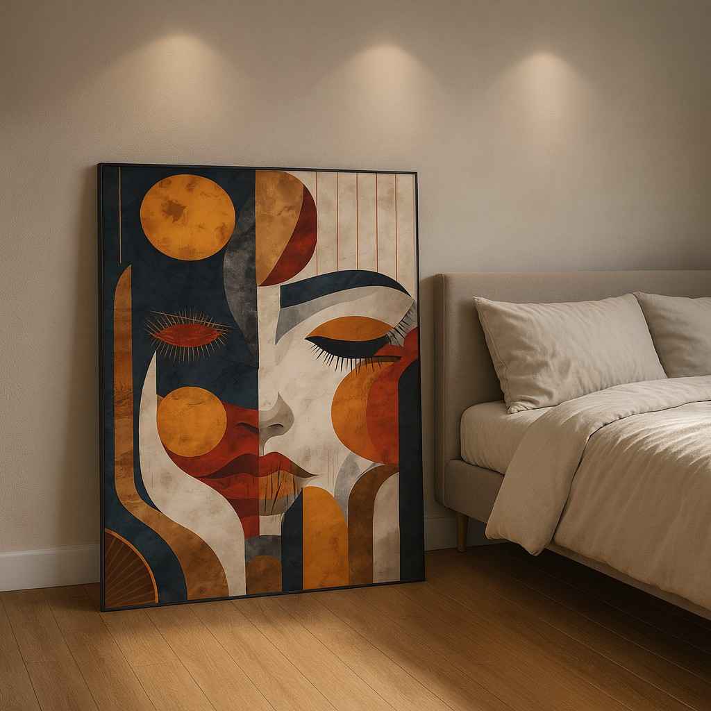 Bring artistic calm and modern elegance into your space with this Abstract Face Modern Wall Art. Designed with a stylized human face formed through bold geometric shapes and warm earthy tones, this artwork reflects balance, emotion, creativity, and inner peace. The harmonious blend of beige, rust orange, deep blue, and soft neutrals makes it a perfect fit for modern and minimalist interiors.