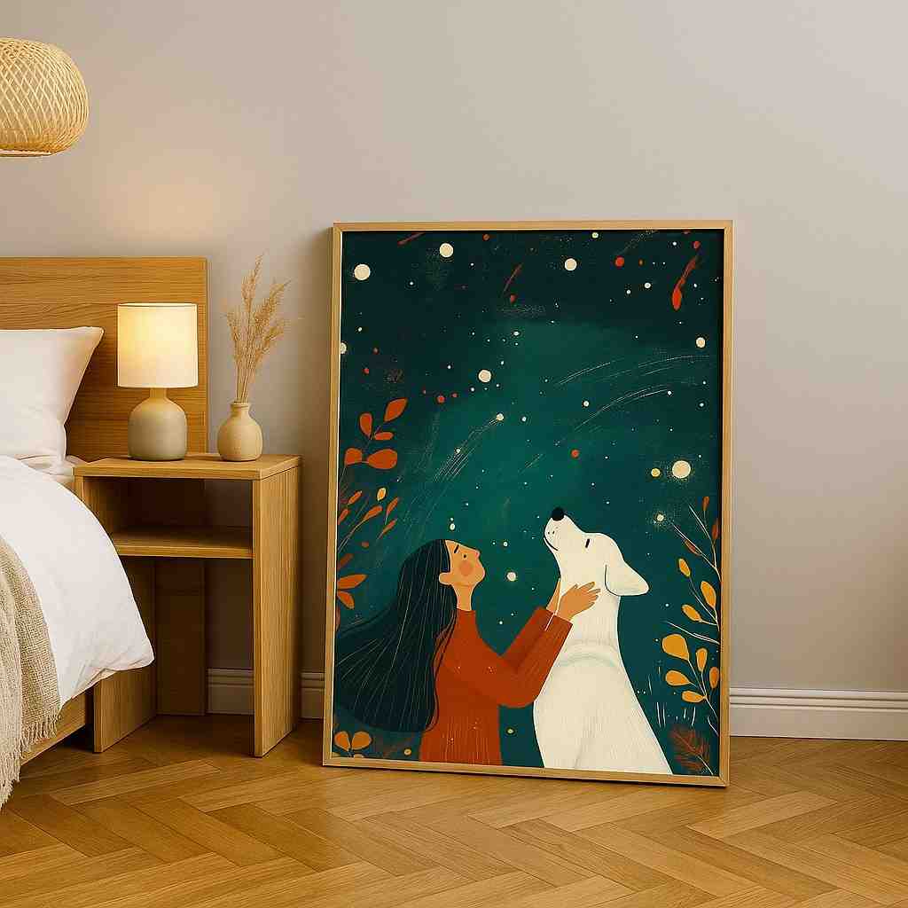 Celebrate the purest form of love with this Girl & Dog Canvas Wall Art by Arteriya. Featuring a gentle moment between a woman and her dog under a star-filled night sky, this artwork beautifully captures unconditional love, trust, and companionship.