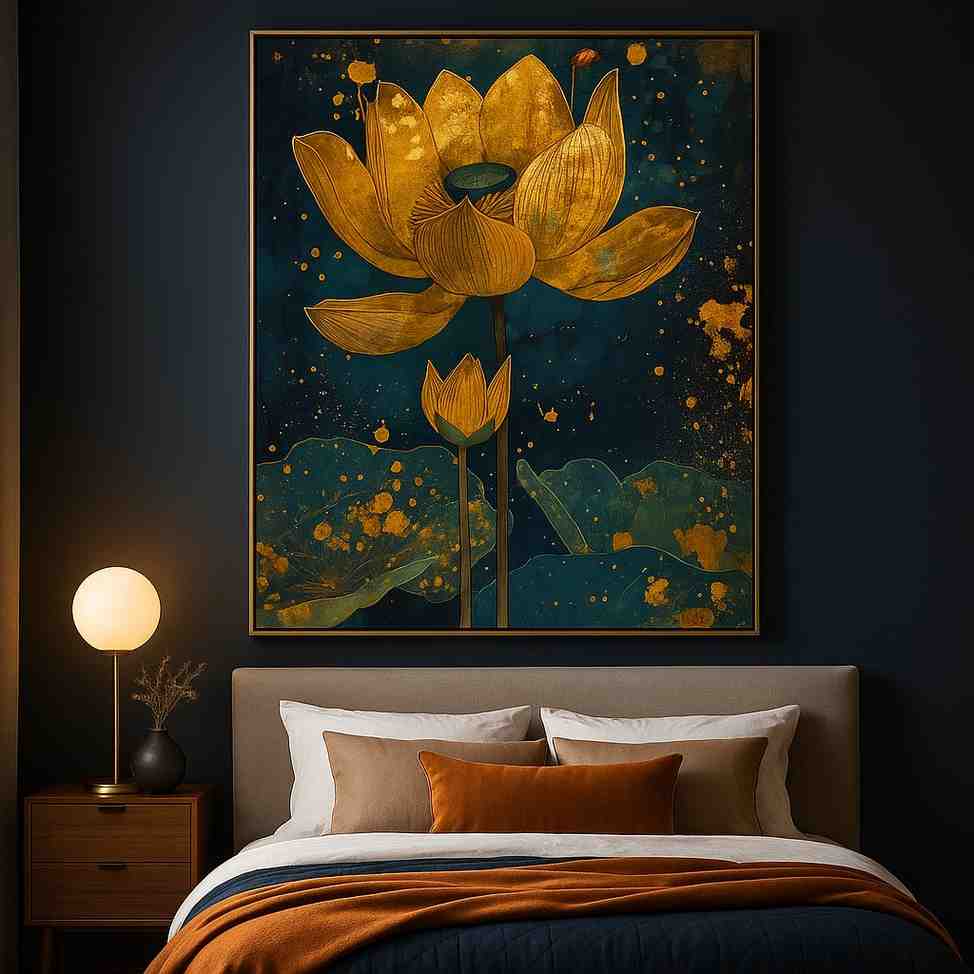 Bring home timeless elegance and serene luxury with this Golden Lotus Modern Wall Art, designed to elevate your living space with artistic sophistication. Featuring a radiant lotus motif in rich golden tones against a deep teal background, this artwork symbolizes peace, prosperity, and positivity, making it a perfect statement piece for modern interiors.
