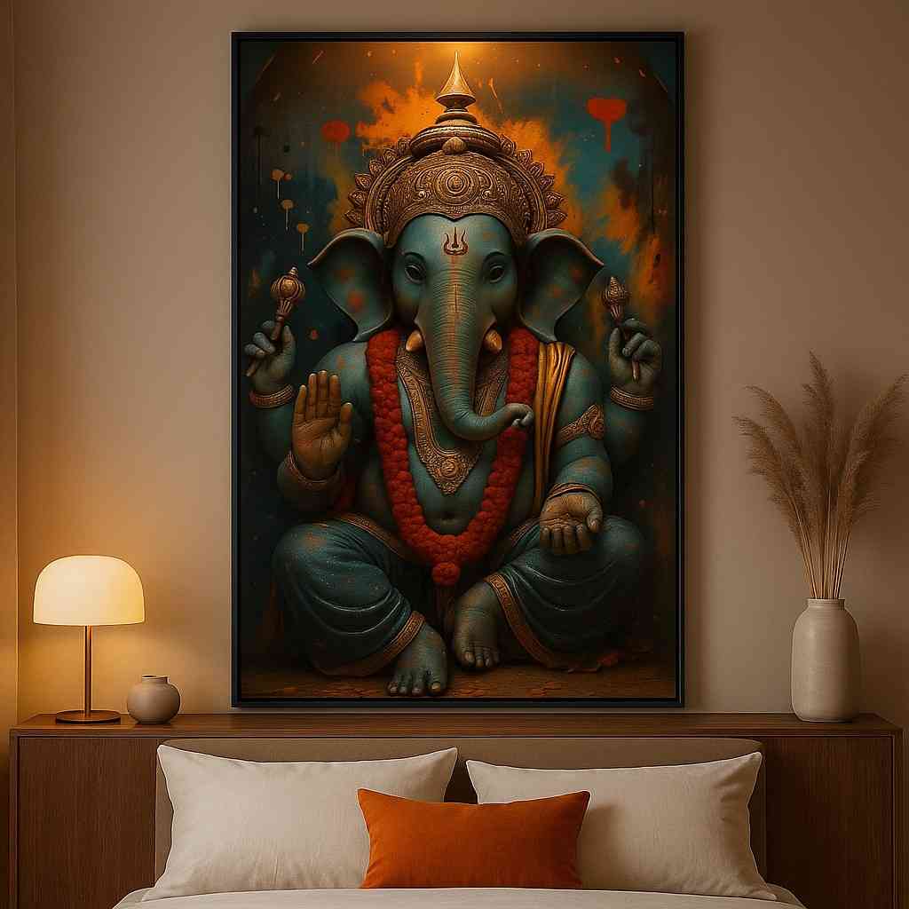 Invite prosperity, wisdom, and positive energy into your home with this Lord Ganesha Wall Art. Featuring Vighnaharta Ganesha seated in a blessing posture, adorned with sacred ornaments and rich textures, this artwork symbolizes success, protection, abundance, and new beginnings. The harmonious blend of teal blue, warm orange, and deep earthy tones creates a powerful yet calming visual presence.