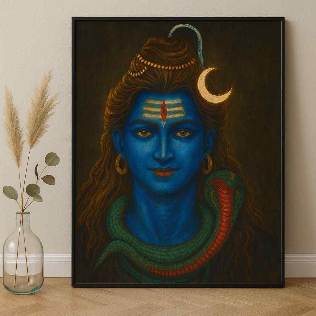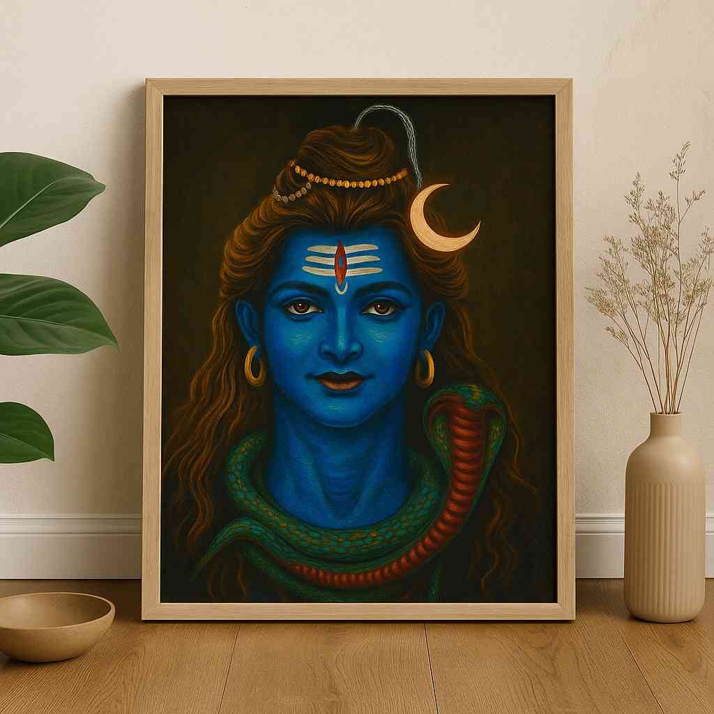 The deep blue complexion represents infinity and cosmic consciousness, while the crescent moon, tripundra, and serpent symbolize balance, time, and inner awakening. Set against a dark, textured background, the artwork radiates tranquility and strength—making it a perfect centerpiece for modern spiritual interiors.