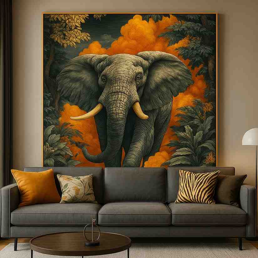 Bring strength, wisdom, and commanding presence into your space with this Majestic Elephant Wall Art. Featuring a powerful elephant emerging through dramatic golden-orange clouds surrounded by lush foliage, this artwork symbolizes power, stability, protection, prosperity, and leadership. The striking contrast of deep greys, earthy greens, and vibrant orange tones creates a visually arresting masterpiece.