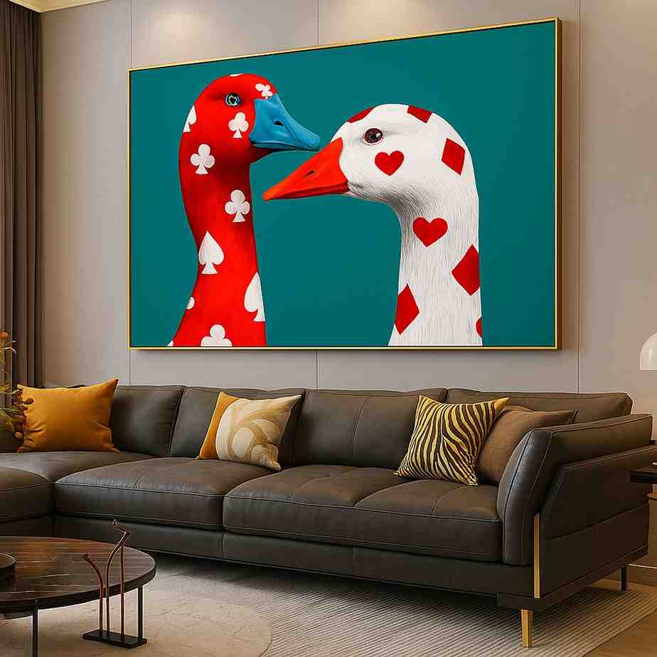 Add a touch of charm, affection, and contemporary elegance to your space with this Love Birds Canvas Wall Art by Arteriya. Featuring two stylized ducks facing each other, adorned with heart and card-suit motifs, this artwork beautifully symbolizes love, connection, and playful romance.
