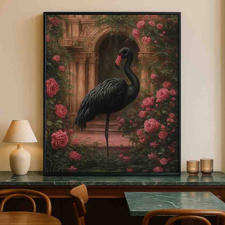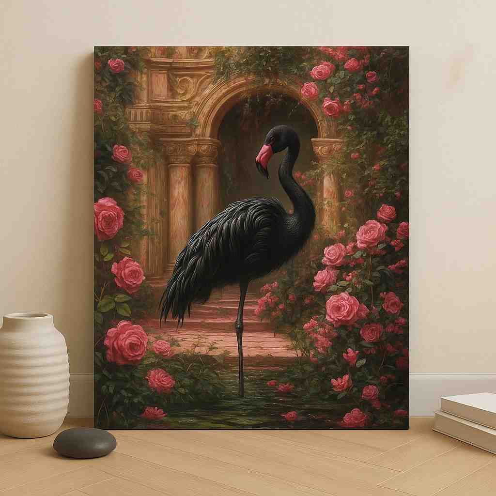 Bring timeless elegance and artistic drama to your interiors with this luxury black flamingo canvas painting, designed to transform your space into a statement of refined taste. Featuring a majestic black flamingo set against a romantic floral garden with classical architectural arches, this artwork blends modern sophistication with vintage charm.