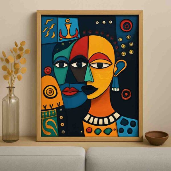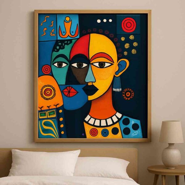 Bring culture, color, and contemporary style to your walls with this Premium Modern Abstract Tribal Couple Wall Art. The painting features two expressive faces merged into one bold composition, showcasing striking geometric patterns, symbolic motifs, and a rich multicolor palette that instantly elevates your interior.
