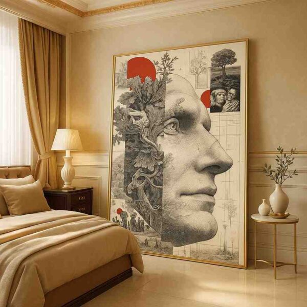 Enhance your interiors with this Premium Sketch Collage Face Art (30×48 inches) — a unique blend of nature, architecture, and portrait illustration. This modern conceptual artwork depicts a human profile merging with tree roots, classical sketches, and scenic landscapes, symbolizing growth, memory, evolution, and creativity.